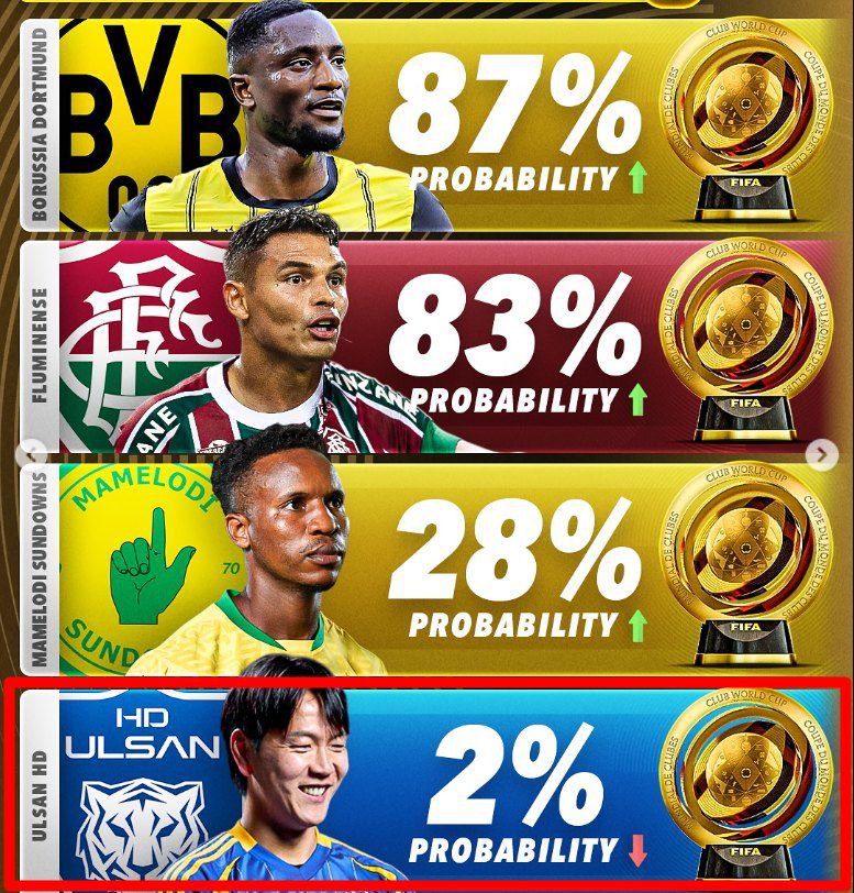 (엑스포츠뉴스 권동환 기자) 울산HD가 현재 참가 중인 2025 국제축구연맹(FIFA) 클럽월드컵에서 토너먼트에 진출할 확률이 겨우 2%인 것으로 드러났다.