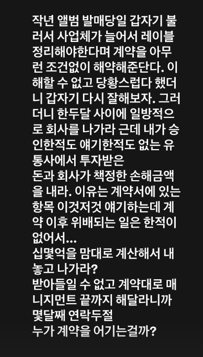 작년 앨범 발매 당일 갑자기 불러서 사업체가 늘어서 레이블 정리해야 한다며 계약을 아무런 조건 없이 해약해준단다. 이해할 수 없고 당황스럽다 했더니 갑자기 다시 잘해보자. 그러더니 한두 달 사이에 일방적으로 회사를 나가라 근데 내가 승인한 적도 얘기한 적도 없는 유통사에서 투자받은 돈과 회사가 책정한 손해금액을 내라. 이유는 계약서에 있는 항목 이것저것 얘기하는데 계약 이후 위배되는 일은 한 적이 없어서...