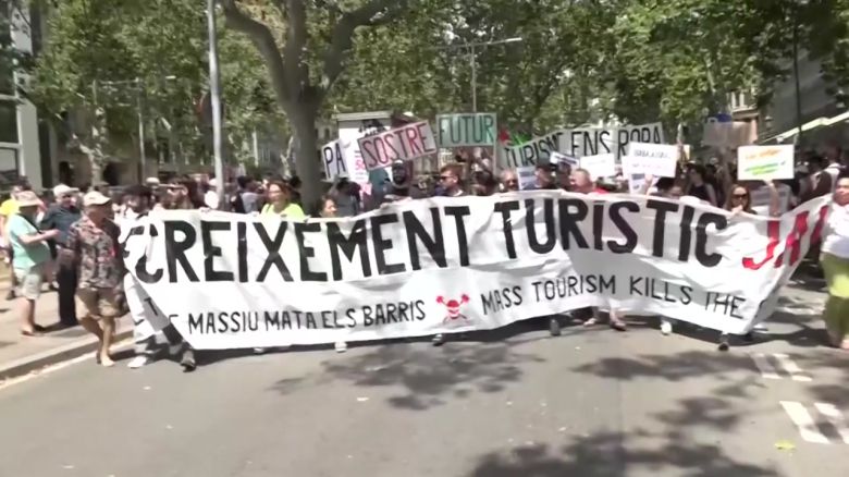 스페인 바르셀로나에서 시위대 수백 명이 '관광객은 집으로 돌아가라'고 쓴 현수막을 들고 거리를 행진합니다.