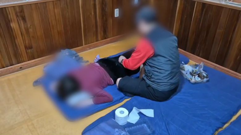 집 안에서는 한 남성이 매트에 엎드려 누워있는 여성의 등에 침을 놓고 있습니다.
