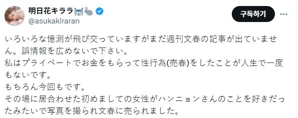 아스카 키라라는 21일 새벽 자신의 소셜 계정에 "여러 가지 억측이 난무하고 있습니다만, 아직 주간 문춘의 기사가 나오지 않았습니다. 잘못된 정보를 퍼뜨리지 마세요"라고 글을 올렸다.