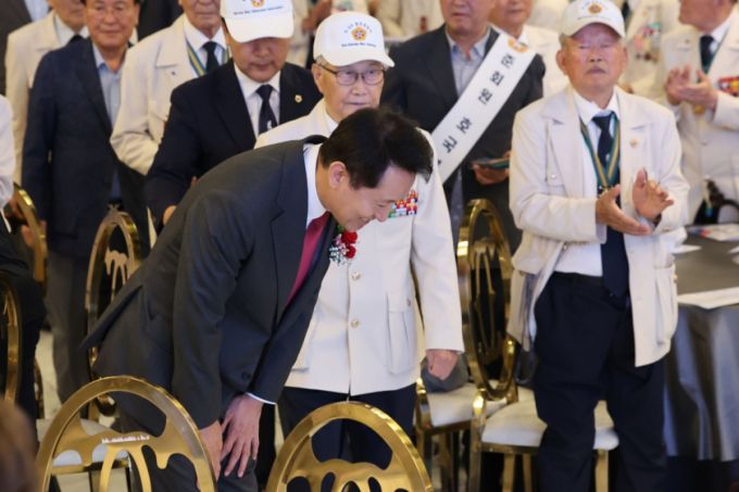[서울=뉴시스] 권창회 기자 = 오세훈 서울시장이 20일 오전 서울 마포구 제75주년 6.25전쟁 참전유공자 위로연 및 준회원 호국봉사단 발대식에서 6.25 참전용사들에게 인사하고 있다. 2025.06.20. kch0523@newsis.com /사진=권창회 |