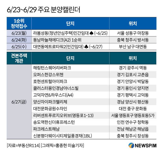 [서울=뉴스핌] 송현도 기자 = 부동산R114는 6월 마지막 주 전국 3개 단지에서 총 930가구(일반분양 650가구)가 분양을 시작한다고 21일 밝혔다.