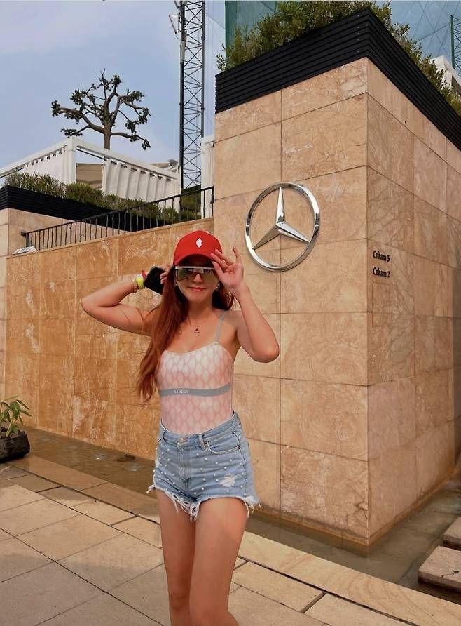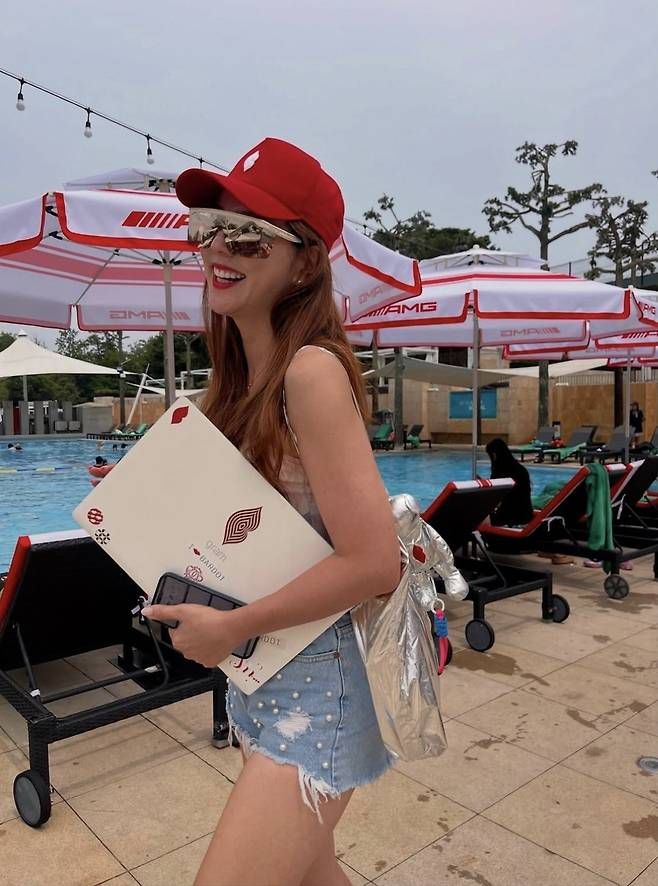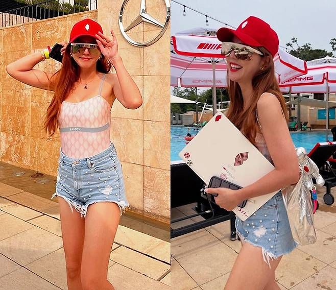 붉은 볼캡과 미러 선글라스로 시선을 단번에 사로잡은 이윤미는, 핑크빛 슬리브리스 수영복에 진주 장식 데님 핫팬츠를 매치하며 Y2K 무드를 완벽히 소화했다.