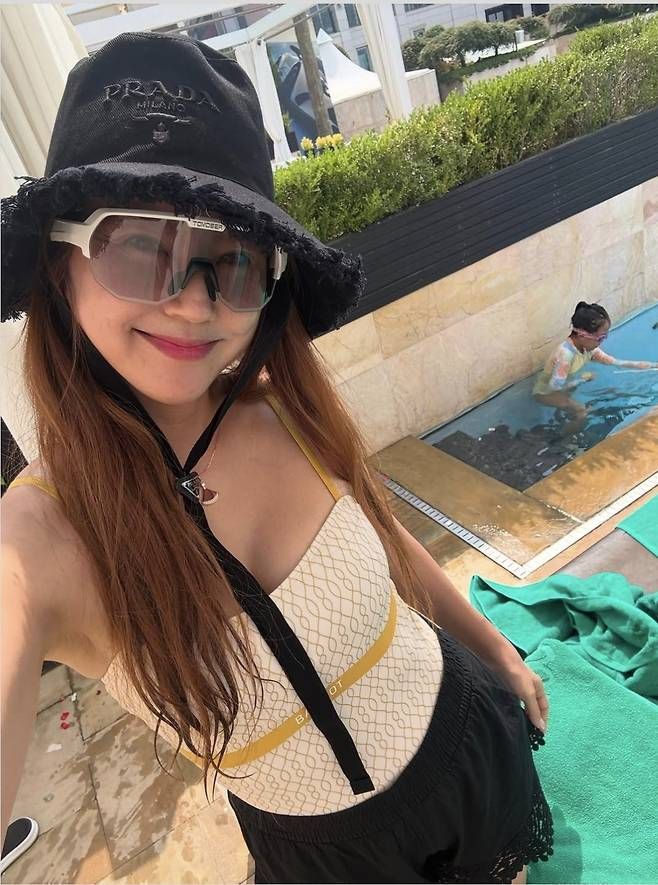 하지만 진짜 눈에 띈 건, 수영장 한복판에서 노트북을 들고 있는 이윤미의 모습이었다. 누군가는 휴가고, 누군가는 일상인 곳에서 그녀는 그 사이를 자유롭게 넘나들며 엄마이자 여성으로서의 정체성을 스타일로 표현했다.