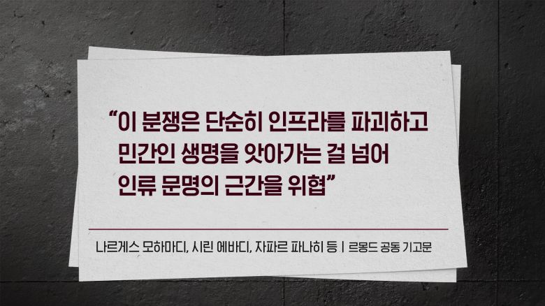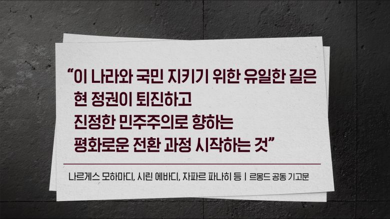 이렇게 악화된 경제 현실 속에서 노벨 평화상 수상자인 반정부 인권운동가인 나르게스 모하마디 그리고 시린 에바디와 올해 칸 영화제의 황금 종려상을 받은 영화감독 자파르 파나이 등은 현지 시각 16일 프랑스 일간 르몽드에 공동 기고문을 내기도 했습니다.