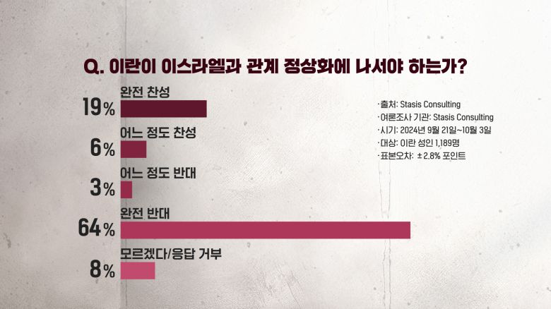 물론 이란 국민들의 입장에서는요. 당연히 이스라엘에 대한 불만도 상당할 겁니다. 지난해 10월 여론조사를 보면요. 이란이 이스라엘과 관계 정상화에 나서야 한다고 보느냐는 질문에 완전히 반대한다는 답변이 64%였습니다.