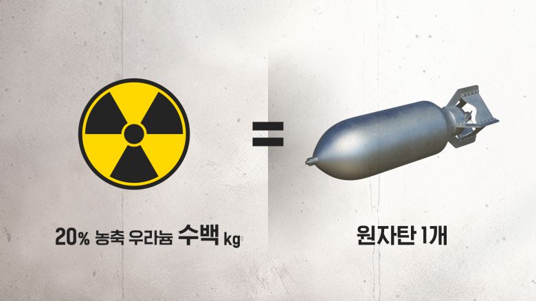 현재 이란이 60% 수준까지 간 것만 해도 딱 한 단계만 더 원심분리기를 거치면 무기급이 바로 나올 수 있는 수준이기 때문에 핵무기를 만드는 데 쓰이는 무기급 우라늄, 약 90% 수준 이상으로 가는 직전 단계라고 볼 수가 있습니다.