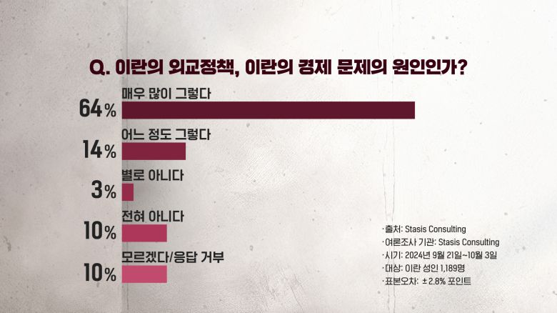 이란인들을 대상으로 이루어진 지난해 여론조사에 따르면요. 이란의 외교 정책이 이란 경제 문제에 어느 정도까지 원인이 되는지 묻는 질문에 전체의 64%가 이란의 외교 정책이 이란 경제 문제에 매우 많이 원인이 된다, 이렇게 답을 했습니다.