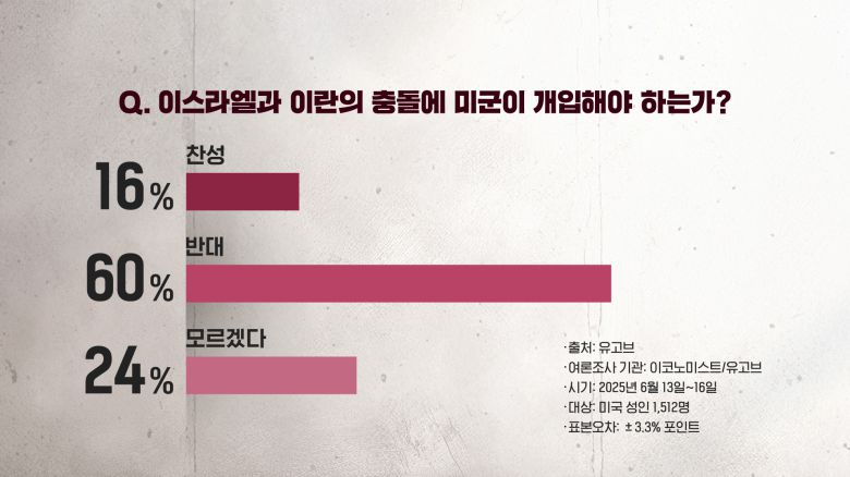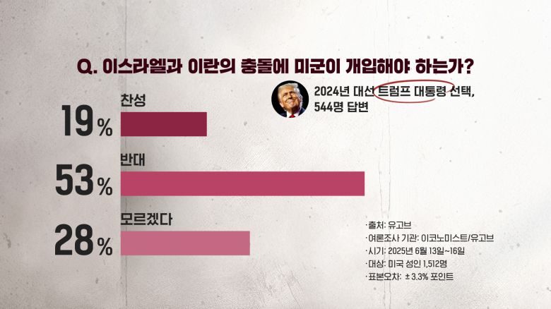 최근 미국 시민 1500여 명을 대상으로 한 조사에서 이스라엘과 이란의 충돌에 미군이 개입을 해야 하느냐라는 질문에 응답자의 60%가 반대하고 16%가 찬성했는데 정치 성향으로 분류해서 보면 작년 대선에서 트럼프 대통령을 선택한 이들 가운데 53%가 반대를 했고 찬성은 19%였습니다.