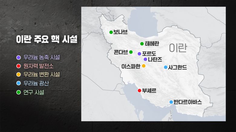 우선 이란의 주요 핵시설이 어디 있는지 살펴보겠습니다. 이번에 가장 큰 공격을 받은 우라늄 농축 시설 나탄즈를 포함을 해서요. 포르도 농축 시설, 부셰르 원자력 발전소 그리고 이스파한 우라늄 변환 시설 등이 있습니다. 그리고 우라늄 광산으로는 사그한드 그리고 반다르아바스, 이런 곳들이 있는데요.