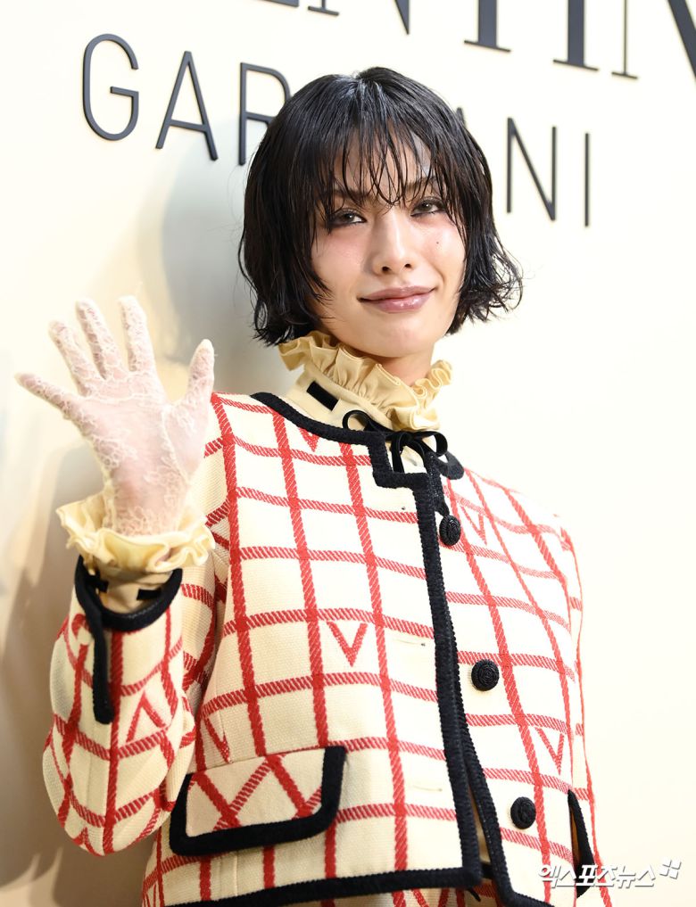 특히 형광 라임 컬러의 시스루 타이츠와 젖은 듯한 질감의 쇼트 커트 스타일링은 전통적인 체크 셋업과 극명한 대비를 이루며 나나 특유의 엣지를 부각시켰다. 손에 든 크림 컬러 미니백과 블랙 하이힐은 전체 룩의 조화를 끌어올리는 균형 잡힌 선택이었다.