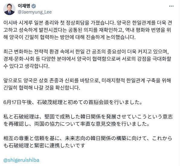 일본 이시바 총리 또한 한국어와 일본어를 병기한 글을 SNS에 게재하면서 디지털 공간에서의 상호 존중 외교 사례로 주목받았다.