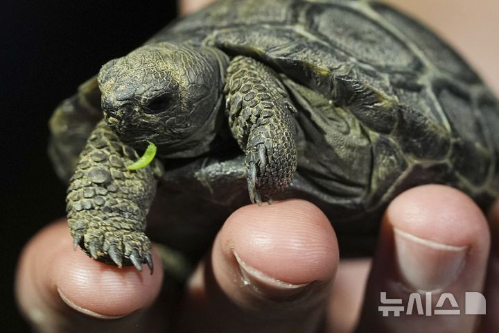 [필라델피아=AP/뉴시스] 23일(현지 시간) 미 펜실베이니아주 필라델피아 동물원에서 이곳 직원들이 약 100살 된 갈라파고스 거북 ‘마미’가 부화시킨 새끼 거북 네 마리 중 한 마리를 공개하고 있다. 마미는 지난 2월 처음으로 새끼 네 마리를 부화시켜 동물원 150년 역사상 최초의 갈라파고스 거북 부화 사례를 기록했으며, 최고령 초산으로도 이름을 올렸다. 2025.04.24.