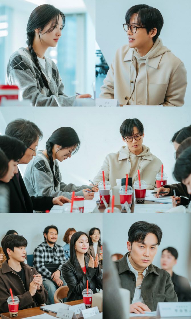SBS 금토드라마 ‘우리영화’(연출 이정흠/ 극본 한가은, 강경민/ 제작 스튜디오S, 비욘드제이)에서 감독 이제하(남궁민 분), 주연 배우 이다음(전여빈 분)을 비롯한 채서영(이설 분), 제작자 부승원(서현우 분)까지 영화 ‘하얀 사랑’을 만들 주역들이 총출동한 첫 대본 리딩 현장이 포착됐다.