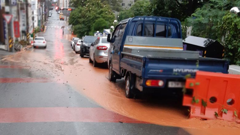▲ 정체전선이 남하해 폭우가 쏟아지는 21일 오전 광주 서구 쌍촌동 한 도로에 인근 공사장 토사가 빗물을 타고 유출되고 있다.