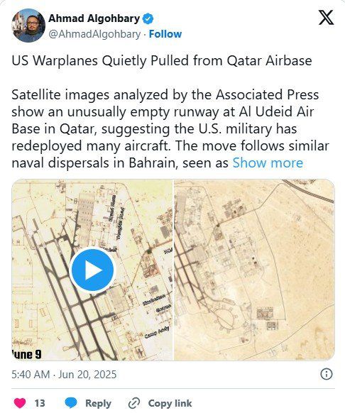 이스라엘 매체 '타임스 오브 이스라엘'은 20일(현지시간) 위성사진 분석업체 플래닛 랩스를 인용해 카타르 알 우데이드(Al Udeid) 미군기지의 항공기 배치 변화를 보도했다. 보도에 따르면 지난 5일까지만 해도 기지 내에는 C-130 수송기와 정찰기 등 40대 가까운 미군 항공기가 포착됐으나, 19일 위성사진에서는 단 3대만 남아 있는 것으로 나타났다.