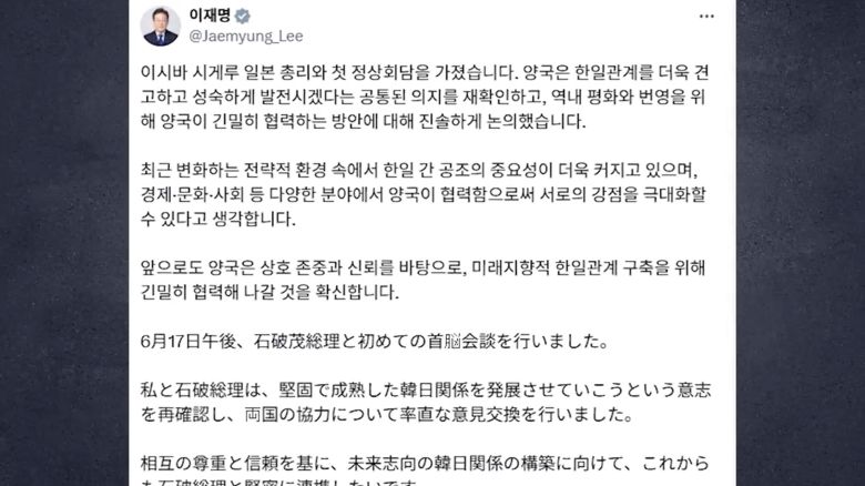 이시바 시게루 일본 총리 또한 한국어와 일본어를 병기한 글을 SNS에 게재하면서 "디지털 공간에서의 상호 존중 외교 사례로 주목받았다"고 대통령실은 전했습니다.