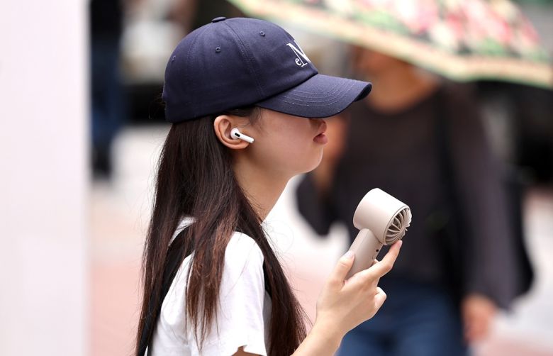 대구 중구 동성로에서 한 시민이 손 선풍기를 들고 길을 걷고 있다. 뉴시스 |