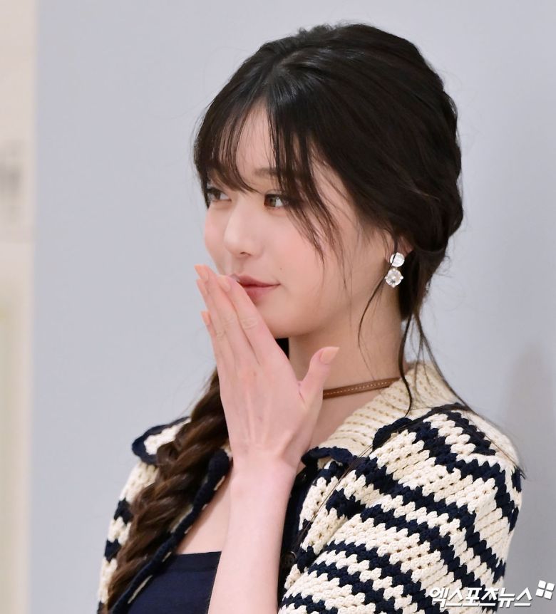 장원영은 크로셰 스타일의 스트라이프 니트 셋업과 튜브톱을 매치해 레트로 감성을 살리면서도 트렌디한 분위기를 완성했다. 여기에 하이 포니테일을 땋은 헤어스타일, 크림 컬러의 토트백, 그리고 회색 삭스와 로퍼 조합까지 더해지며 고급스러운 룩을 완성했다.
