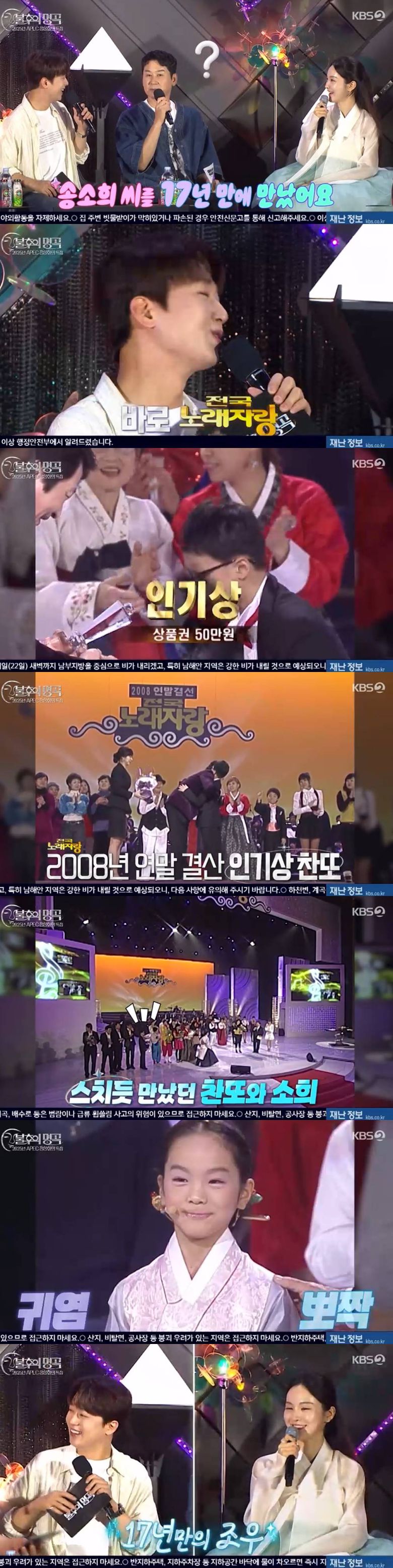 2008년 연말 결산 인기상은 이찬원, 상반기 최우수상은 송소희가 차지했다. 17년만 재회에 MC들은 "경주에서 이렇게 조우를 하네요"라며 이들의 인연을 신기해했다.