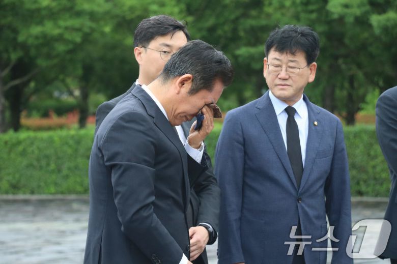 (서울=뉴스1) = 더불어민주당 당 대표에 출사표를 던진 정청래 의원이 21일 오후 경남 김해시 진영읍 봉하마을을 찾아 노무현 전 대통령 묘역을 참배하며 북받치는 감정에 눈가를 훔치고 있다. (정청래의원실 제공. 재판매 및 DB 금지) 2025.6.21/뉴스1