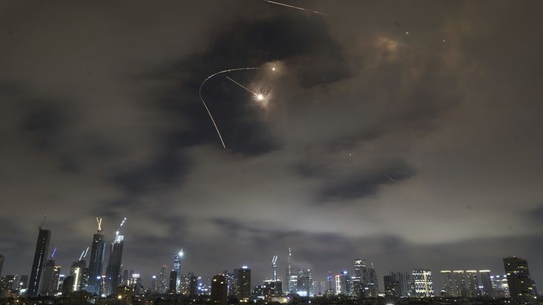 ▲ 이란이 발사한 미사일이 21일 이스라엘 텔아비브 상공에서 포착된 모습