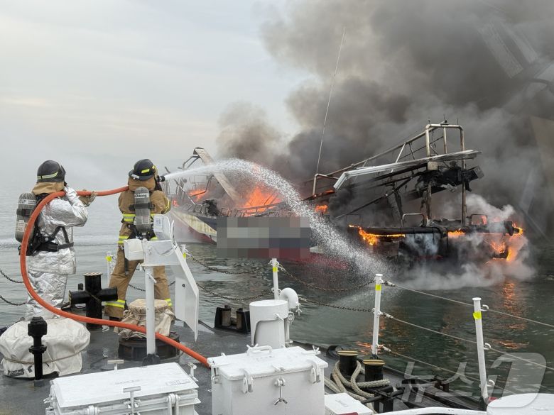 21일 오후 인천 옹진군 영흥도 인근 해상에서 발생한 선박 화재 현장에서 소방 대원들이 화재 진압을 하고 있다. 인천해양경찰서는 낚시어선 A호(9.77톤, 승선원 22명) 기관실에서 화재가 발생했다는 신고를 접수, 즉시 경비함정, 구조대, 연안구조정 등을 급파했으며 평택해경 경비함정, 소방 등과 화재 진압을 했다. (인천해양경찰서 제공. 재판매 및 DB 금지) 2025.6.21/뉴스1