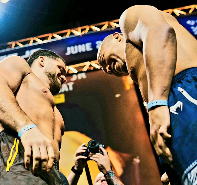 이스마일 나우르디예프와 박준용이 2025년 6월 아제르바이잔 바쿠 크리스털 홀 UFC on ABC 8 공개 계체 행사에서 마주보다 웃고 있다. 사진=TKO