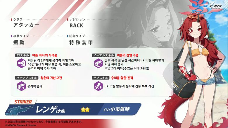 이중 렌게(수영복)은 오랜만에 추가된 2성 학생이다. 픽업 기간이 끝나면 통상 뽑기에 추가돼 상시로 획득 가능해진다. PV에서 공개된 '고료 나구사(수영복)'은 내년 이벤트 복각 때 만나볼 수 있다.