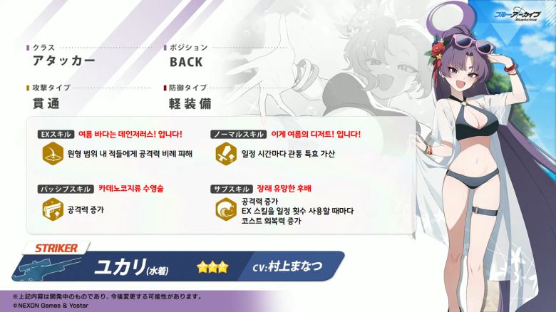 유카리(수영복)은 원본과 동일하게 스트라이커 광역 딜러로 설계됐다. EX 스킬 '여름 바다는 데인저러스!입니다!'는 원형 범위 내 모든 적에게 피해를 주는 단순한 효과다. 다만 지금까지 원형 공격 범위를 지닌 관통 딜러가 없다시피 했기에 새롭게 느껴진다.