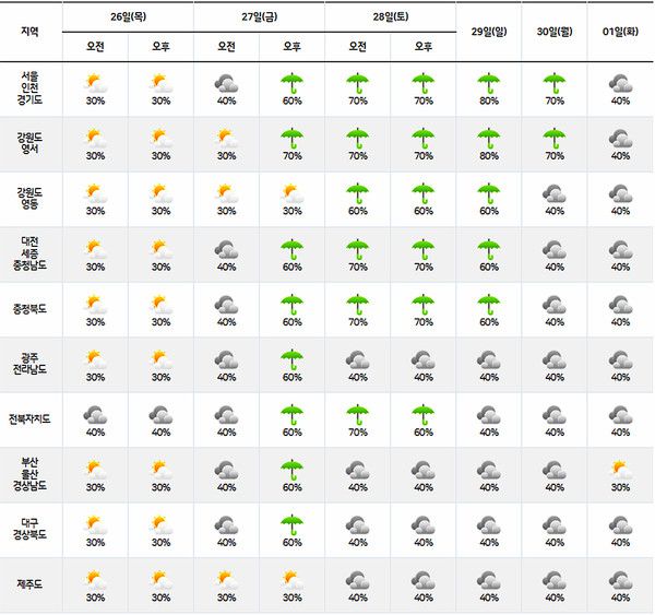 금요일인 27일은 전국 대부분 지역(제주도와 강원영동 제외), 28일(토) 전북, 28일(토)~30일(월) 중부지방을 중심으로 6월 마지막째주 주말에는 비가 내리겠다.
