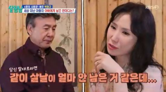 박영규는 "내가 살면 얼마나 살겠어"라며 사람들 앞에서 당당하게 선언하고 자신이 먼저 아내 곁을 떠나도 아내와 딸 위해 열심히 살고자 한 것이라고 털어놨다.