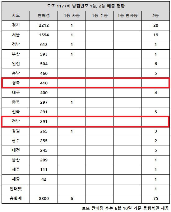 동행복권이 21일 추첨한 로또 1177회 당첨번호 조회 결과 1등은 6명, 2등은 75게임이다. 전국 17개 시도 중 경북 전남 지역에서는 로또 고액(1,2등) 당첨 판매점이 단 한 곳도 나오지 않았다. |