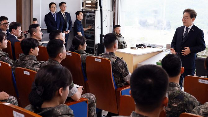 이재명 대통령이 지난 13일 경기도 연천군 육군 25사단 비룡전망대에서 장병들을 격려하고 있다. (사진=연합뉴스) |