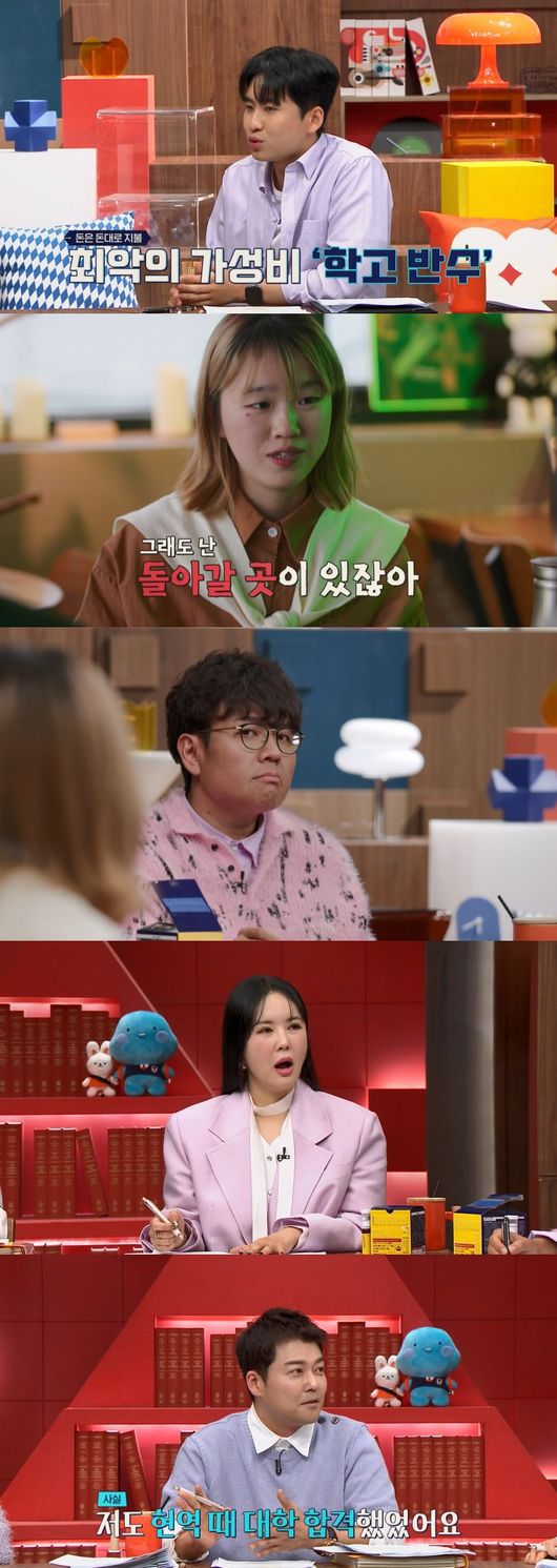 그런 가운데 도전학생은 “고3 때는 미래에 대한 불안감 때문에 집중이 안 됐는데, 지금은 공부에 집중이 더 잘 된다”며 대학에 등록해 놓은 후 안정감을 느끼고 있다고 밝혔다. 또 친구들과 만난 도전학생은 “그래도 돌아갈 곳이 있다”며 이미 등록한 대학을 보험으로 여기는 마인드를 보였다. 이 모습에 ‘티벤저스’ 정승제&조정식&미미미누는 어리둥절했다.