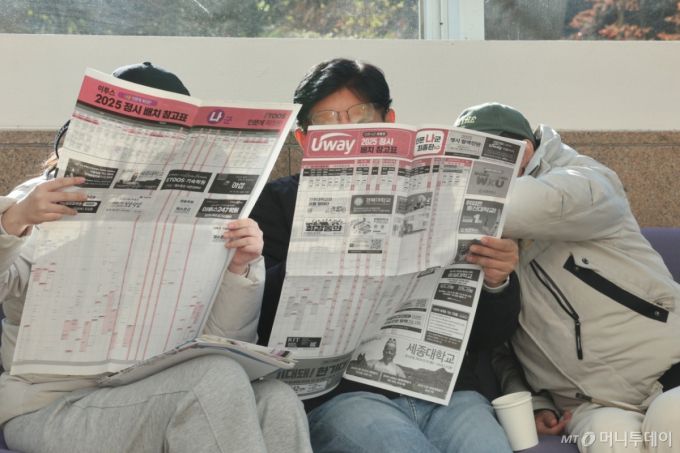 지난해 12월 서울 성북구 국민대학교 콘서트홀에서 열린 국민대 입시전문기관 연합설명회에서 학부모와 자녀가 입시 전략을 살펴보고 있다. 이날 설명회에서는 수능 영역별 결과에 따른 유불리, 무전공(전공자율선택) 모집과 영향 등 최신 입시 트렌드와 의대 정원 증원에 따른 입시 변화 등이 논의됐다/사진=뉴스1 /사진=(서울=뉴스1) 신웅수 기자