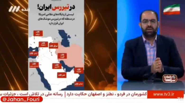 이란 국영방송이 22일 미국의 이란 핵시설 공격 소식을 전하고 있다. 뉴스 진행자는 "농축 우랴늄에는 영향이 없다. 방사능 누출도 없다"며 "이제 미국인과 미국 군 기지는 이란의 합법적 공격 대상"이라고 주장했다. 왼쪽의 지도는 중동에 위치한 미국의 주요 군 기지를 나타낸 것이다. /IRIB 방송 소셜미디어 캡춰 |