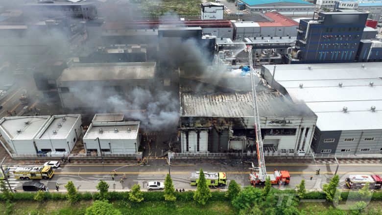 24일 오전 경기 화성시 서신면의 일차전지 제조 업체인 아리셀 공장에서 불이 나 소방 당국이 진화에 나섰다. (독자제공)2024.6.24/뉴스1 |
