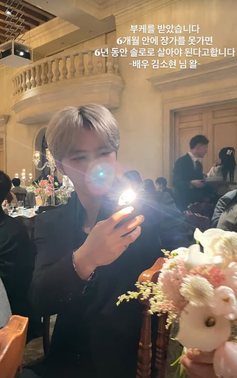 특히 사진 위에 적힌 멘트가 시선을 강탈했다. 김재중은 "부케를 받았습니다"라며 "6개월 안에 장가를 못 가면 6년 동안 솔로로 살아야 된다고 합니다"고 했다. 이어 김재중은 글 말미에 "배우 김소현 님 왈"이라는 문구를 덧붙였다.