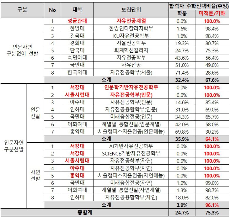 종로학원이 대학입학정보포털 '어디가'에 공시된 연세대, 중앙대, 인하대 등 주요 17개 대학의 정시 일반전형 합격자 수학 선택과목을 분석한 결과, 전공자율선택형인 유형 1 전형 합격자 중 이과생 비율이 75.3%로 압도적으로 높았다. 문과생 기준인 '확률과 통계' 선택자는 전체의 24.7%에 불과했다.