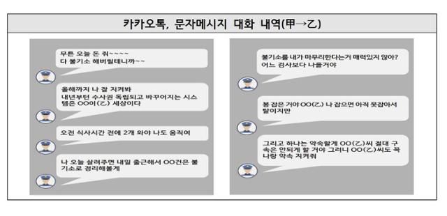 경기 의정부경찰서 소속 경위 정모씨가 피의자 김모씨와 나눈 대화 내역. 서울중앙지검 제공 |