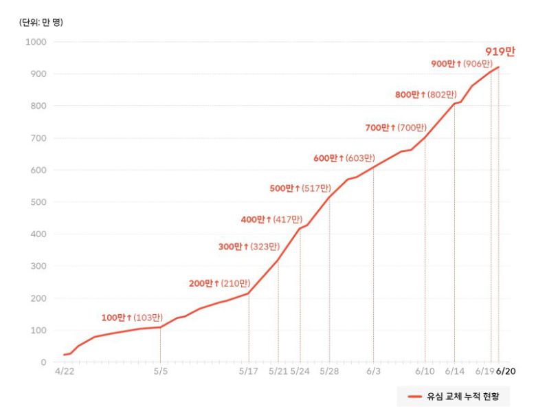 이날 SK 텔레콤 뉴스룸에 따르면 전날 유심을 교체한 고객은 10만명으로 누적 929만명을 기록했다. SK텔레콤은 지난 4월 28일부터 유심 무상 교체를 진행하고 있다. 일일 유심 교체 인원은 6월 16일(33만명)을 정점으로 점차 감소 추세다.