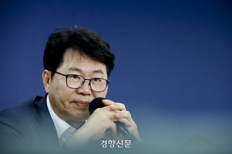 이한주 국정기획위원회 위원장이 22일 서울 정부서울청사 창성동 별관에서 열린 기자간담회에서 취재진 질문을 듣고 있다. 문재원 기자