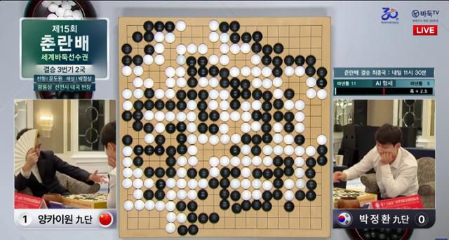 박정환 9단이 22일 중국 선전에서 열린 ‘제15회 춘란배 세계프로바둑선수권대회’(우승상금 15만 달러, 한화 약 2억400만 원) 결승 2국에서 양카이원 9단에게 285수 만에 승리한 직후 복기를 진행하고 있다. 바둑TV 유튜브 캡처