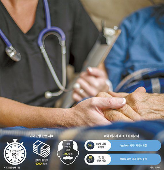 간병은 한국과 마찬가지로 미국 고령층에서 없어서는 안 되는 필수항목이다. 지난 2023년을 기준으로 미국 전역에서 가족(간병인 포함)들이 고령의 가족을 돌보기 위해 할애한 간병 시간은 360억시간에 달한다. 이를 금전적 가치로 환산하면 무려 6000억달러다. 가족이 간병에 지출하는 연평균 금액은 7247달러다.