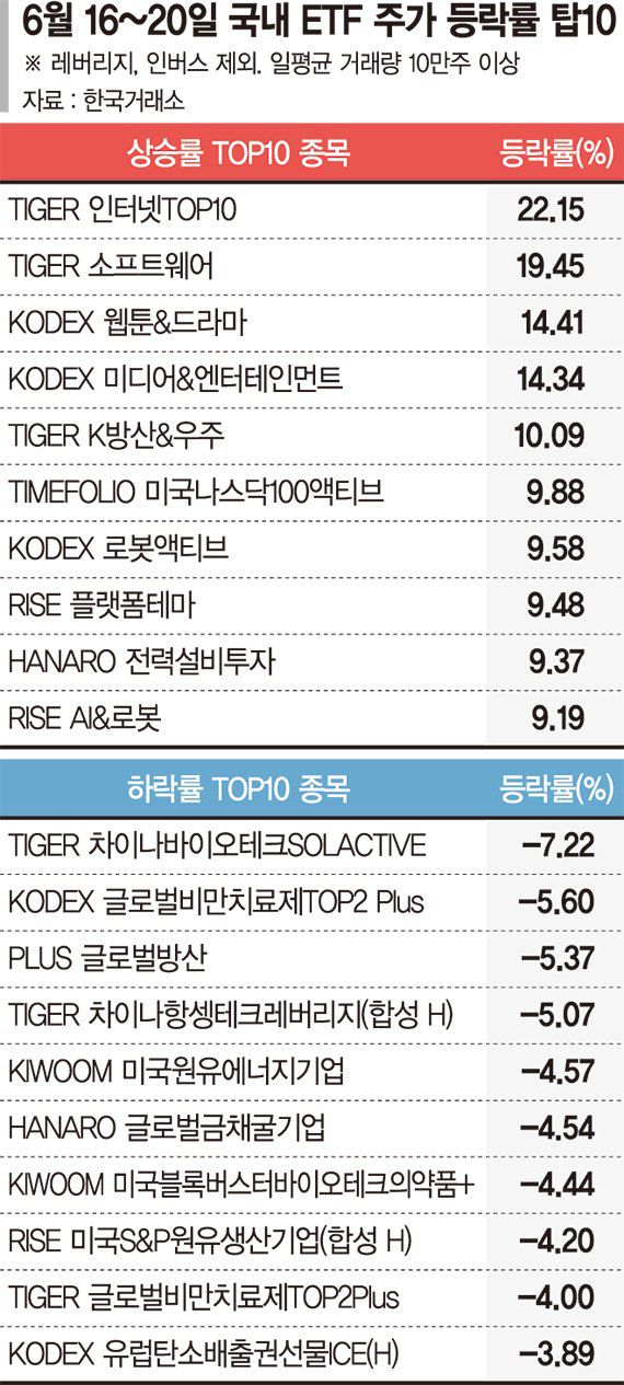 22일 한국거래소에 따르면 지난 16~20일 국내 ETF 시장에서 가장 높은 수익률을 기록한 상품은 'TIGER 인터넷TOP10'으로 22.15% 상승했다. 레버리지, 인버스 종목과 일평균 거래량 10만주 미만 종목을 집계에서 제외한 기준이다. 이외에도 'TIGER 소프트웨어(19.45%)', 'KODEX 웹툰&드라마(14.41%)', 'KODEX 미디어&엔터테인먼트(14.34%)' 등이 뒤를 이었다. 해당 ETF들의 상승을 견인한 것은 네이버와 카카오다. 수익률 상위 1~4위를 차지한 ETF들은 모두 네이버와 카카오의 비중이 34~53%에 달한다. 이 밖에도 각각 상위 7위와 8위를 차지한 'KODEX 로봇액티브(9.58%)', 'RISE 플랫폼테마(9.48%) 등도 네이버와 카카오의 구성 비중이 높은 상품이다.