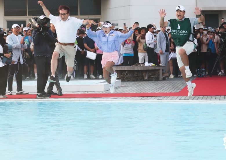 노승희(가운데)가 22일 경기도 안산 더헤븐 컨트리클럽에서 KLPGA 투어 더헤븐 마스터즈 우승을 차지한 뒤 아버지(왼쪽), 캐디와 함께 우승 세리머니로 수영장에 뛰어들고 있다./KLPGA