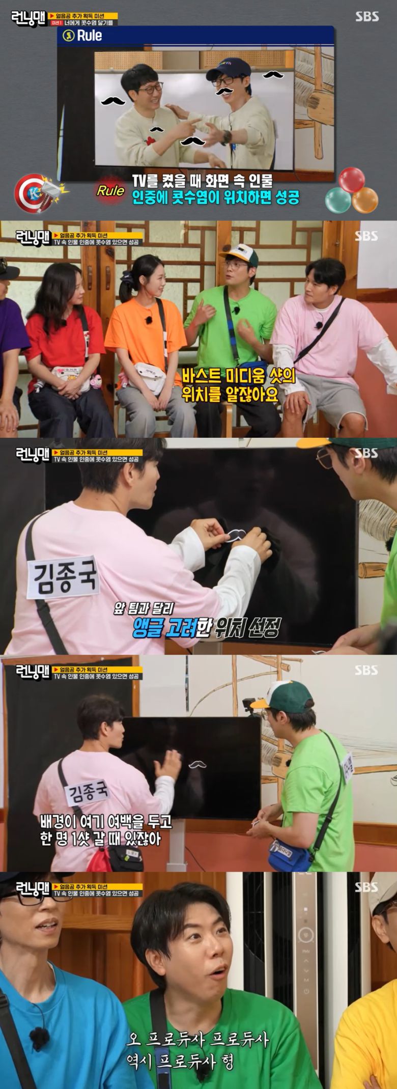 이어 함께 팀이 된 김종국과 최다니엘 앵글 고려해 위치 선정을 했는데, 카메라 각도를 고려하는 김종국의 모습을 본 양세찬은 "오 프로듀사. 프로듀사"라며 2015년 KBS 2TV 드라마 '프로듀사'에서 열린음악회 피디인 김홍순 역으로 연기한 김종국을 언급했다.