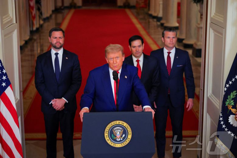 도널드 트럼프 미국 대통령이 21일(현지시간) 미국 워싱턴 DC 백악관에서 이란 핵 시설 공격과 관련한 대국민 연설을 하고 있다. 2025.6.22 ⓒ 로이터=뉴스1 ⓒ News1 송원영 기자 |